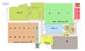- 12 profesionálních badmintonových kurtů Pro Court – umístěné v přetlakové hale